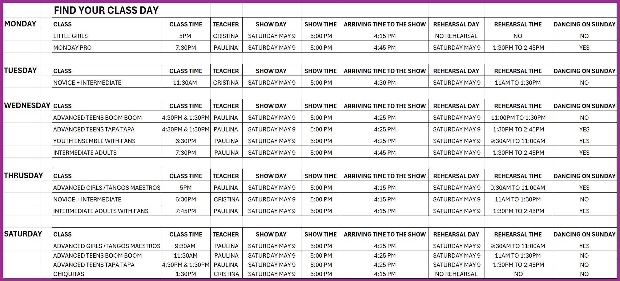 Please check your dancer’s specific rehearsal time and costume details in the full schedule attached.